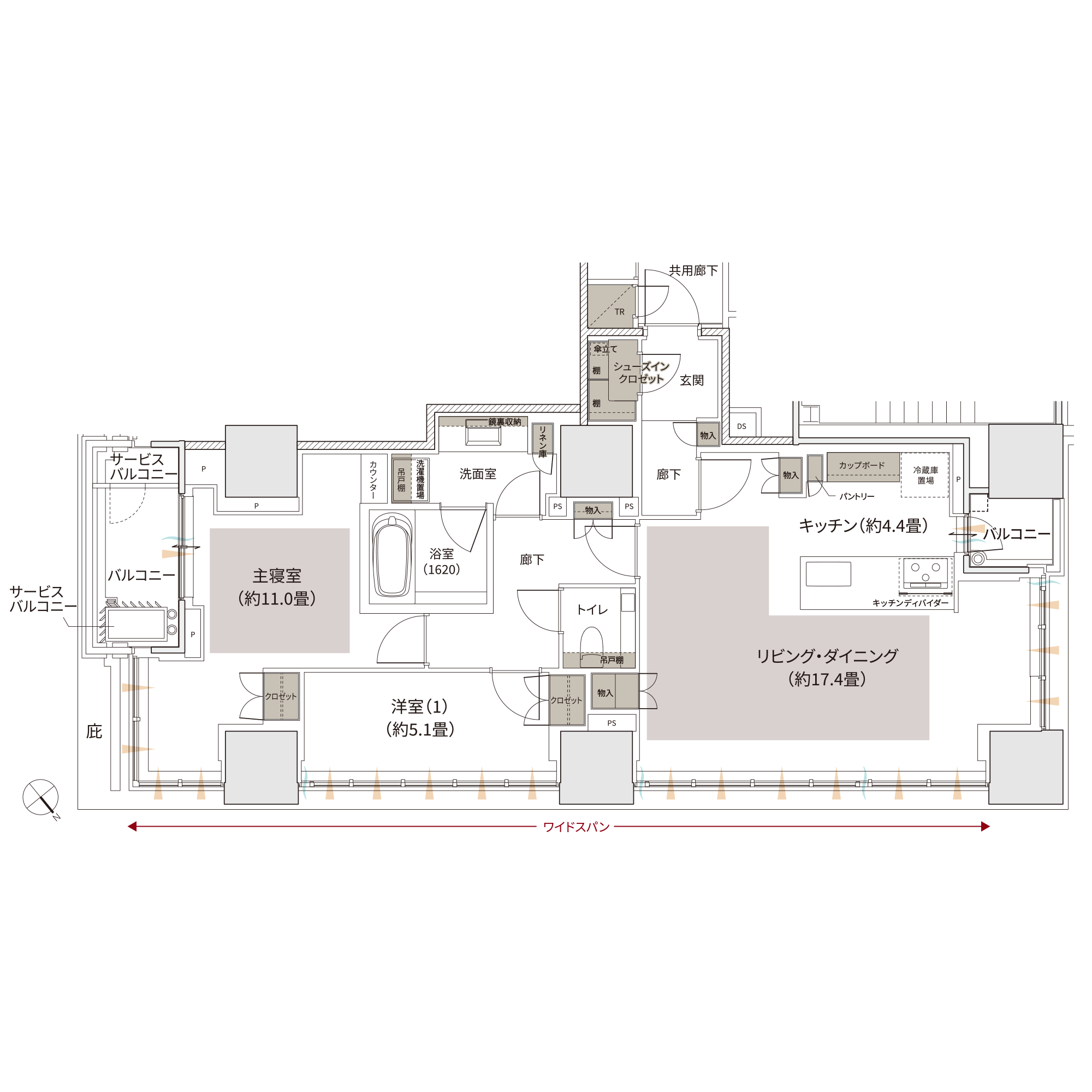 3面採光を実現した設計のセレクトプラン。 リビング・ダイニングを一体に感じられる対面キッチンを採用。 シューズインクロゼットやパントリー、物入等、様々な収納スペースを完備。
