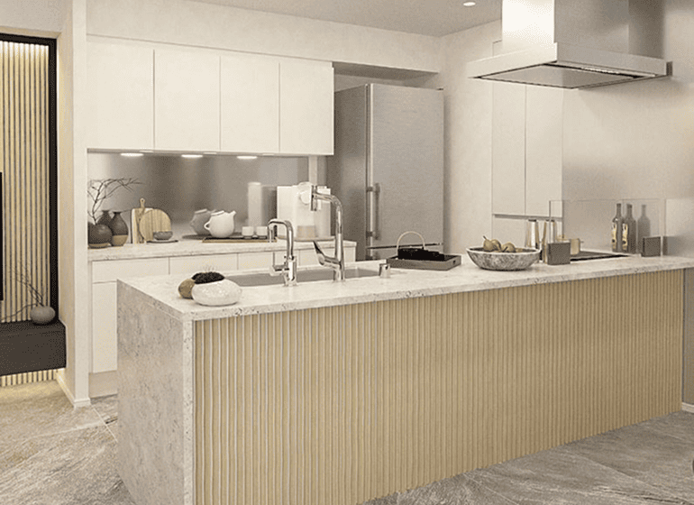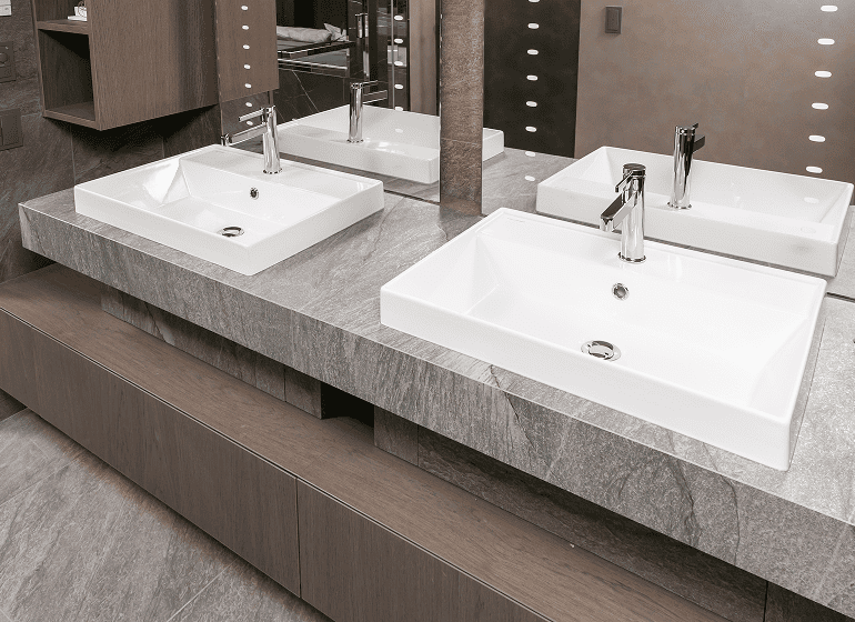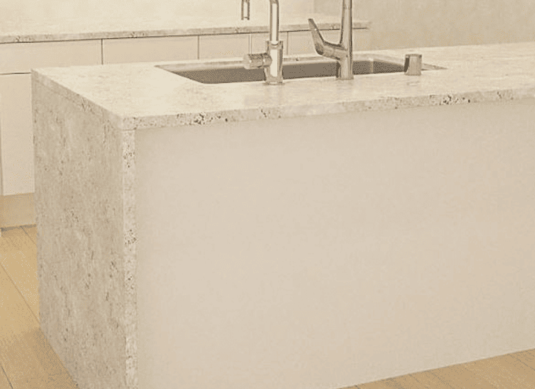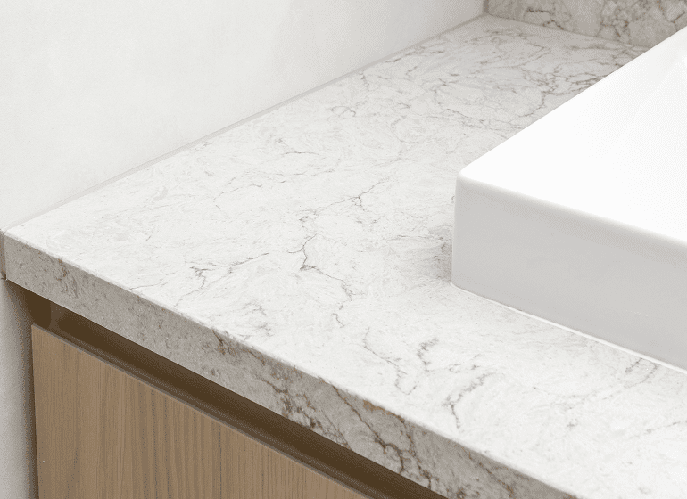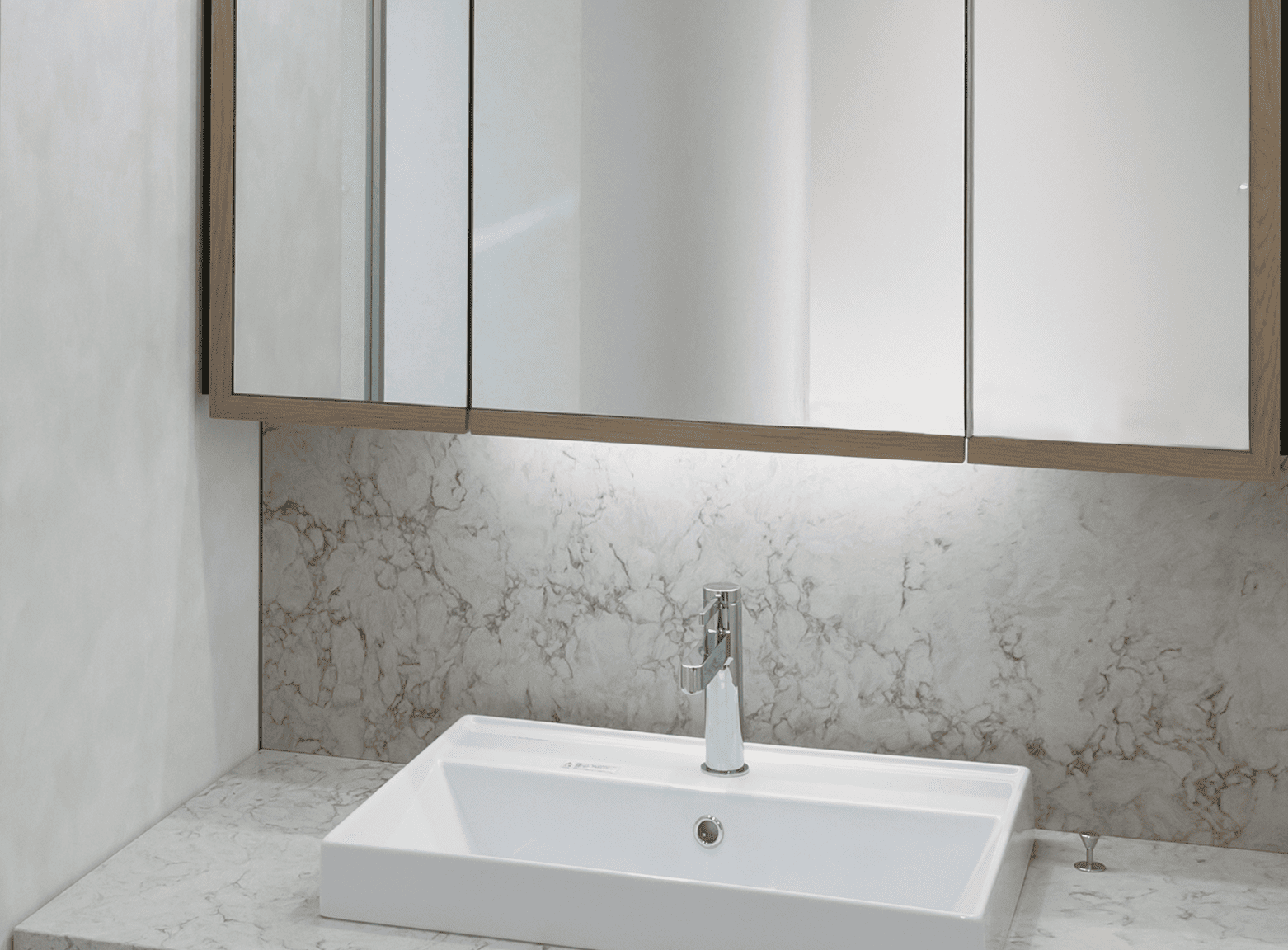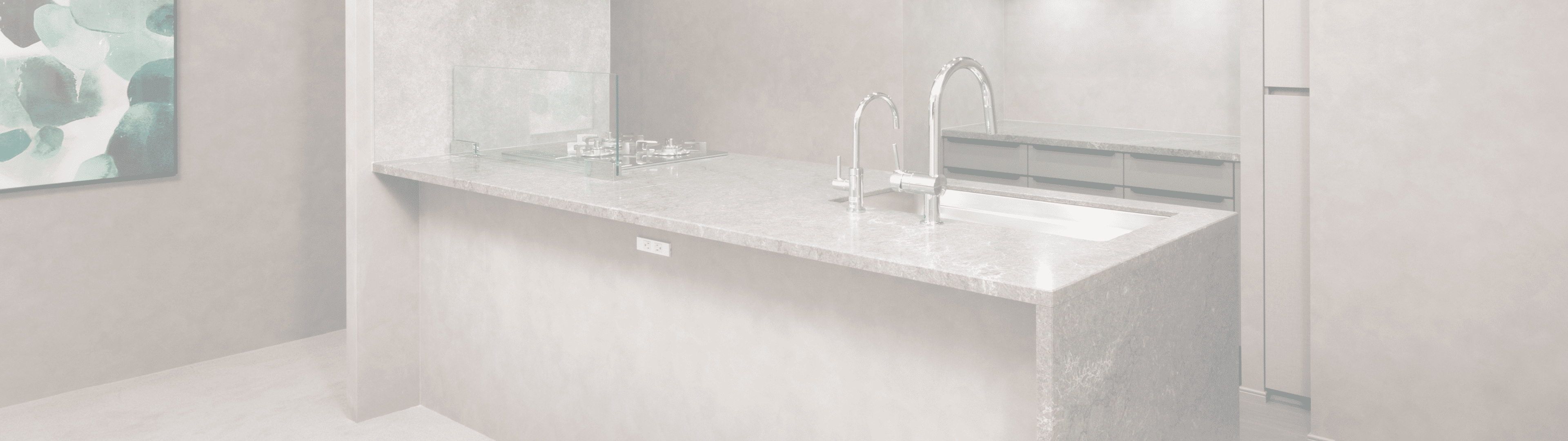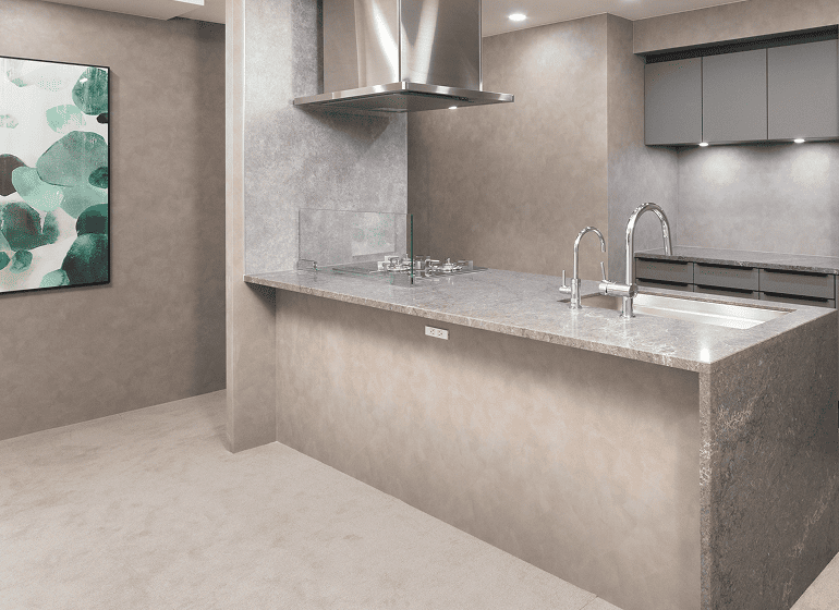 天然鉱物の特性を活かしたエンジニアストーンの先駆者、シーザーストーンを採用。天然素材のもつ美しさと高い硬度による強い耐性、低い吸収率による衛生的な素材。