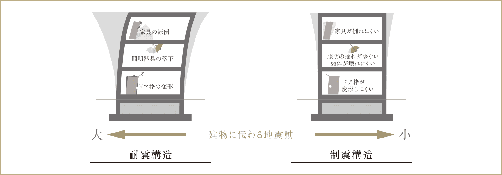 地震による振動エネルギーを吸収する制震壁が建物全体にバランスよく設置され、万が一の地震でも揺れが低減される「制震構造」が採用されています。地震エネルギーが建物に作用すると、建物の柱や壁などがそのエネルギーを負担し損傷を受けます。そこで、振動エネルギーを吸収する制震壁を建物内部に設置し、地震時のダメージを軽減するシステムが制震構造です。