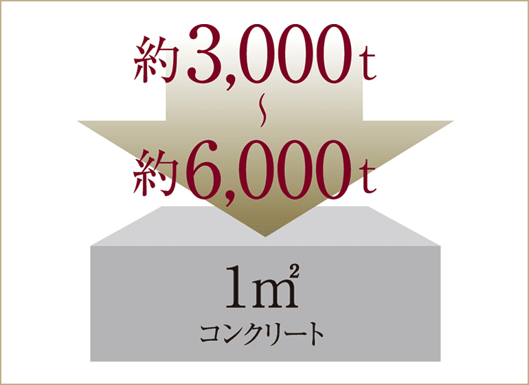 建物の主要な構造部には、設計基準強度30N/㎟~60N/㎟のコンクリートを使用。これは、1㎡当たり約3,000トンから約6,000トンの圧縮力に耐えられる強度です。