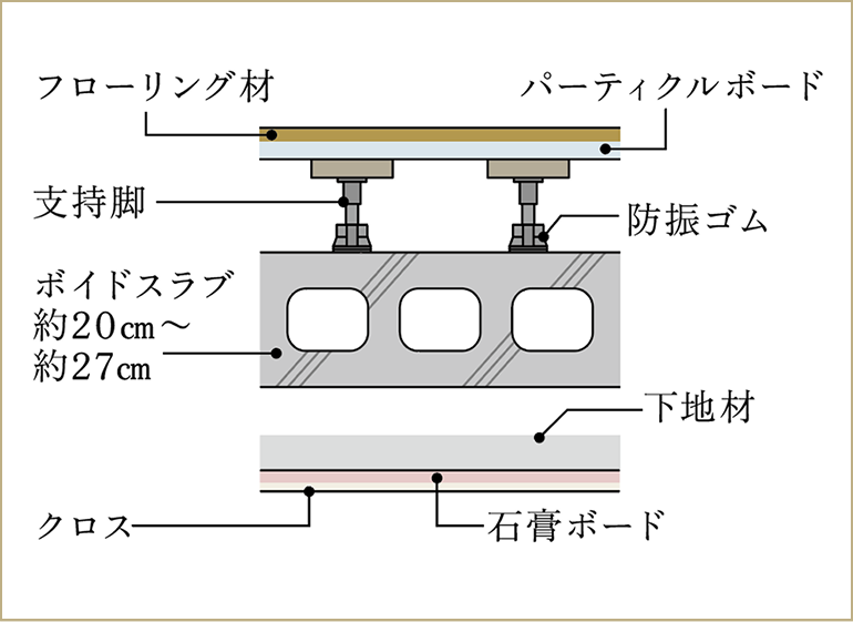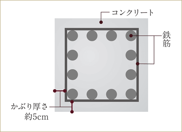 建物の主要な構造部の鉄筋は劣化対策等級3の基準に定められた数値以上のコンクリートかぶり厚さを確保しています。