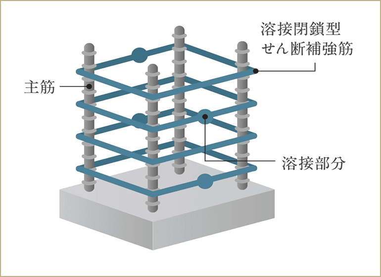 建物の主要な柱には、継ぎ目を溶接した溶接閉鎖型せん断補強筋を採用しています。