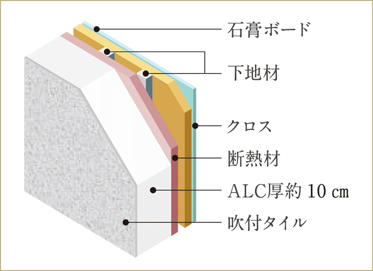 住戸の外壁のALC(軽量気泡コンクリート)の厚さは約10㎝としています。ALCは耐火性、断熱性を有した不燃材料です。